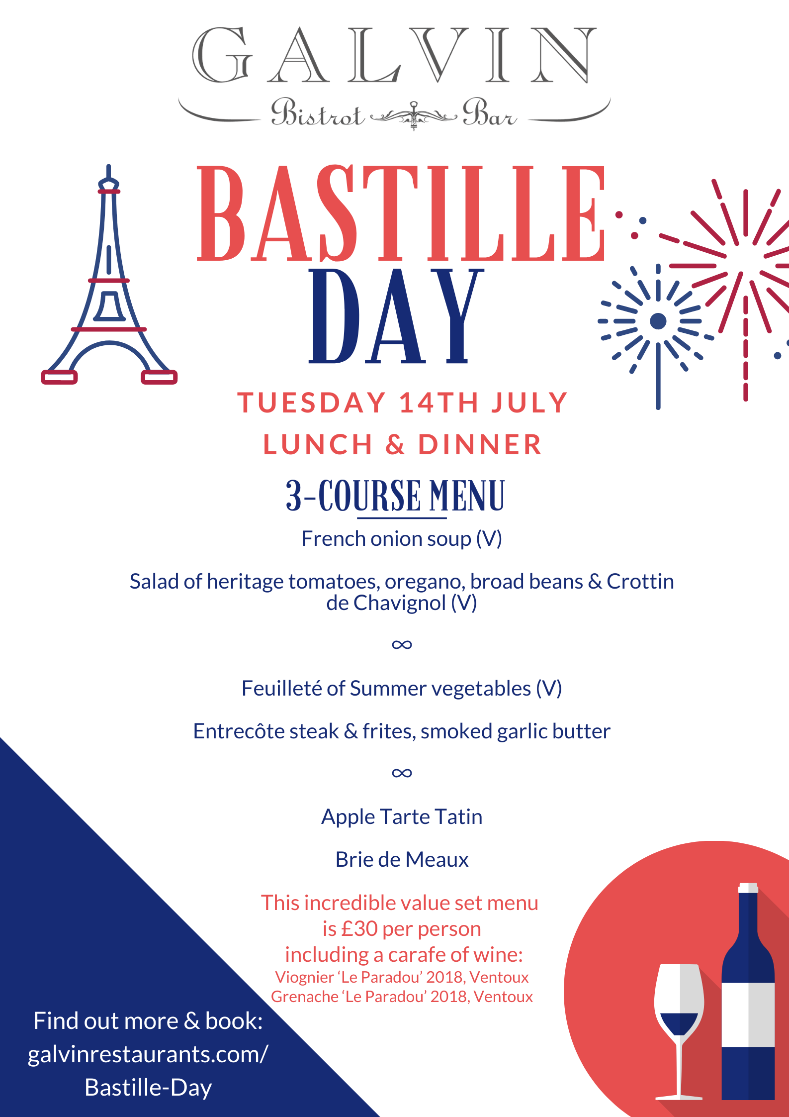 Galvin Bistrot & Bar (par les frères étoilés Galvin) servira un ‘Bastille Day Menu’ pour le lunch et le dinner le 14 Juilllet. Le menu à £30 inclus une demi carafe de Viognier ou Grenache.