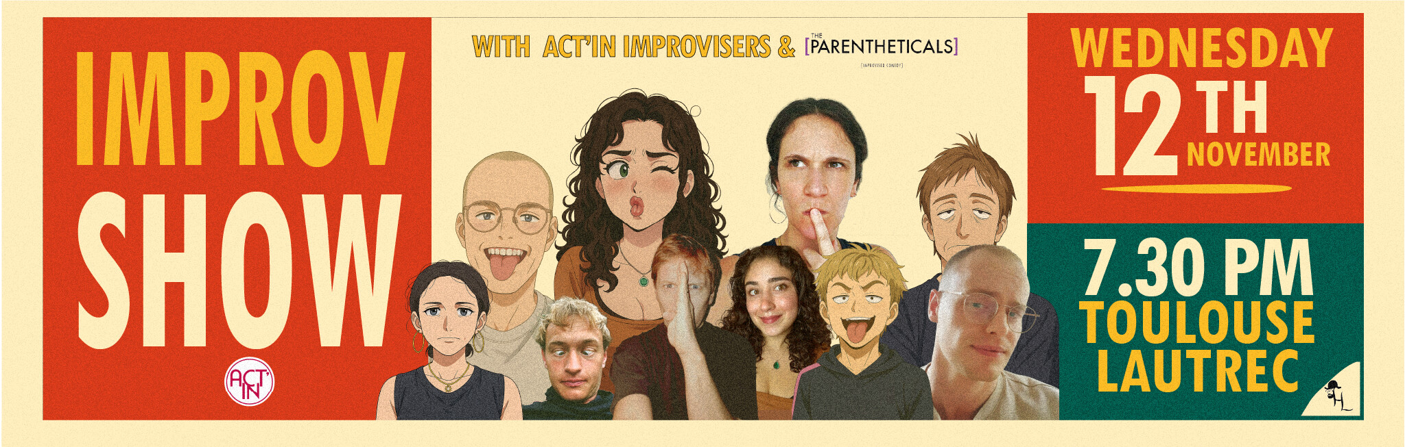 La soirée débutera avec un spectacle dynamique de jeux d’impro et de saynètes pleines de fantaisie, portés par de talentueux comédiens tout juste sortis des ateliers d’improvisation d’Act’in Theatre !